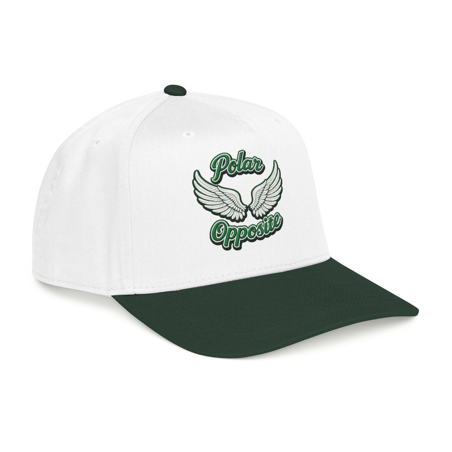 This mid-profile baseball cap brings a relaxed, vintage sports vibe with a clean white crown and deep green undervisor and brim. The embroidered winged logo reads “Polar Opposite” in classic script, giving the cap a playful, rebellious energy that suits streetwear and weekend adventures alike. Structured but not stiff, the five-panel silhouette keeps the front panel seamless so the stitchwork stands out. Wear it on morning runs, at the skate park, or while meeting friends for coffee — it sits comfortably and keeps sun out of your eyes while adding a touch of character to simple outfits.
